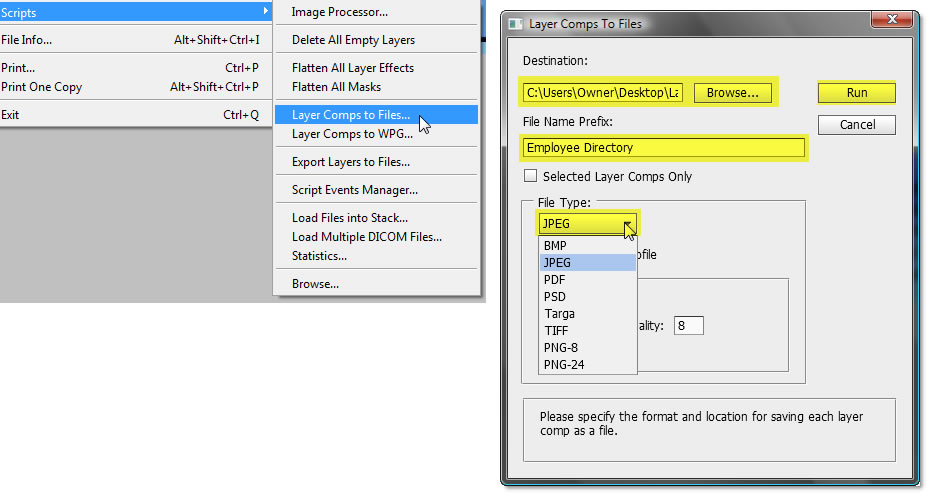 Layer comps allow you to create, manage and preview a variety of images from the same Photoshop file by experimenting with different layer comps (short for compositions). This can save you a ton of time if you need to create a multitude of images that are basically the same but need different text and graphics on each image. A file with a layer comp is smaller than if you had to create each comp separately in a different file. You also have the added advantage of having all of the layer comps in one file for convenience as well as the ability to use them with other applications like Illustrator and InDesign.