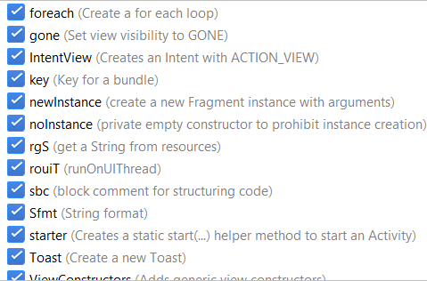 Below are some fo the Live Templates shortcuts for Android: