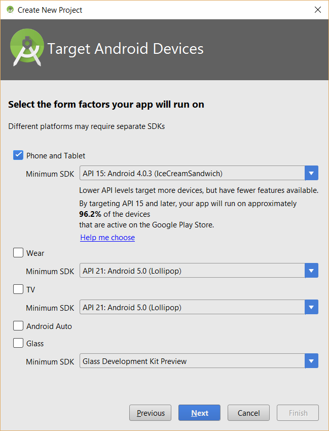 NOTE: If you're not sure, click the Help me choose link to see a listing of all the currently-active versions of Android. Click a link to learn about each. You can also click on the link at the bottom of the screen or go to https://developer.android.com/about/dashboards/.