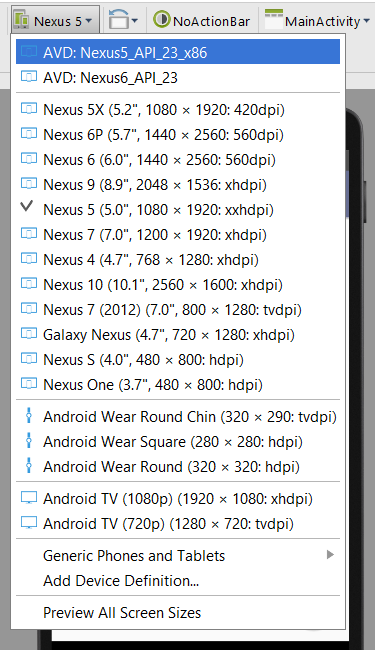 14. CHECK POINT: By default, there will two tabs that are open for each project you create. The Java file is for the main activity class which is a collection of Java classes and the other is its associated XML file that defines the layout. Also, by default, a virtual device will be displayed (e.g., Nexus 4). If you want to change that view, select another device from the list.