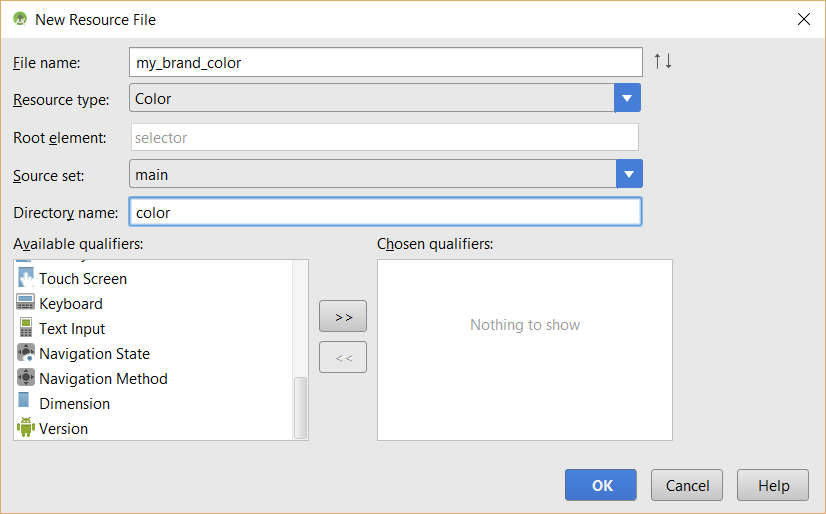 2. In the New Resource File dialog box that appears, assigned it a resource ID name (e.g., my_brand_color.xml).