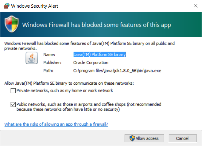 11. If the Windows Security Alert dialog box appears,  unselect Public and select Private and then click the Allow access button.